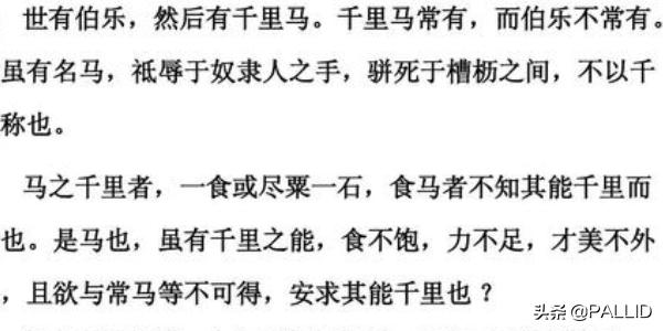 世有伯乐,然后有千里马。千里马常有,而伯乐不常有。故虽有名马,祗辱于奴隶人之手,骈死于槽枥之间,不以千里称也。