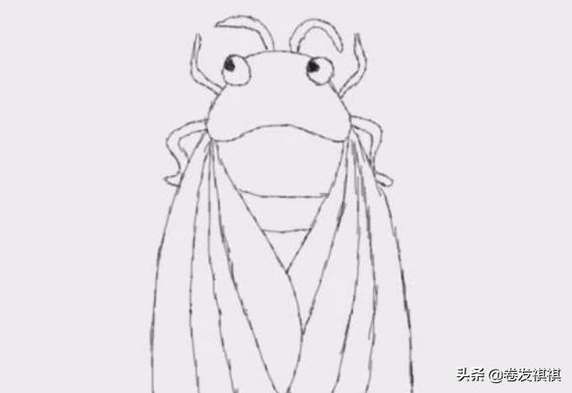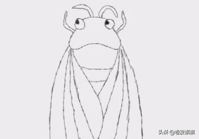 首先画出蝉的脸部的轮廓,画出两只黑黑的眼睛,以及蝉的触角。